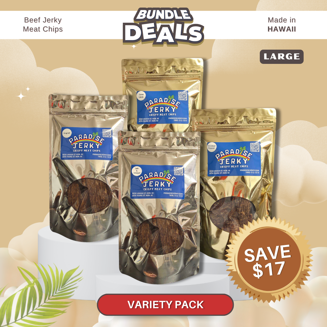 Discover the ultimate Meat Chips experience of with our "[VARIETY] All-4-You" bundle in LARGE, featuring all four of our irresistible flavors.